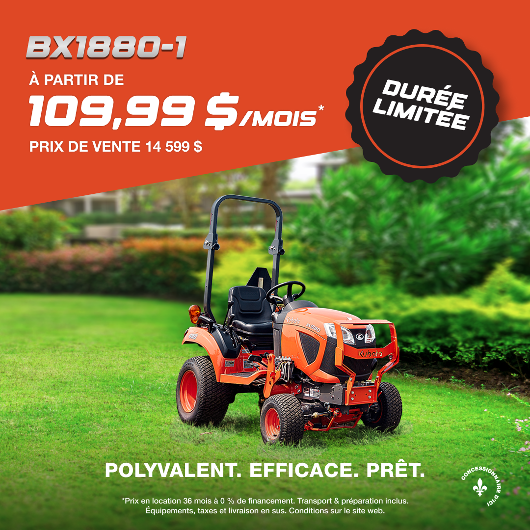 Offre de location disponible sur approbation de crédit. Exemple de location représentatif basé sur un BX1880V-1KBT neuf et non immatriculé auparavant. Le prix de location est de 14 599 $. Taux de location de 0 % (taux effectif de 3,79 %) pendant 36 mois. Le paiement mensuel de location est de 109,99 $ et comprend : 470,19 $ en frais de transport; les frais réglementaires (jusqu'à 3,72 $); les frais d’inscription d’un droit (jusqu'à 391,00 $, y compris les frais de l'agent d’inscription); ainsi que tous les autres frais, droits et redevances applicables (qui peuvent tous varier selon la région et le concessionnaire). Les assurances, l'immatriculation et les taxes de vente applicables sont en sus. Acompte de 1 559 $ ou valeur de reprise équivalente et dépôt de garantie de 0,00 $ dus au début du contrat de location. L'obligation totale de location est de 3 959,64 $. Total de 36 paiements mensuels requis pendant la durée du contrat de location. Allocation de 150 heures; frais de 25,00 $/h pour les heures supplémentaires. Le concessionnaire peut louer à un prix inférieur. Une commande ou un échange du concessionnaire peut être nécessaire (mais peut ne pas être disponible dans tous les cas). L'offre prend fin le 30 juin 2026 et peut être modifiée ou annulée sans préavis. Consultez votre concessionnaire Kubota participant.